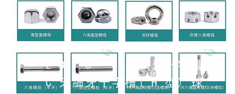 B.S.F. 標準惠氏細牙系列,一般用途圓柱螺紋 (英制牙)fine pitch thread 細牙 full thread 全螺紋 3 螺絲頭型 IHH=ind hex head 鋸 六角頭 PH=phillips 十字槽 Pan 圓頭(盤頭)Oval 半沉頭 H.W.H.. 六角小法蘭 螺栓有:1、方頭螺栓,2、半圓頭方頸螺栓,3、十字槽盤頭螺釘,4、內六角沉頭螺釘,5、方螺母C級,6、蝶形螺母,7、六角頭螺栓,8、十字槽盤頭自攻螺釘。大小有M18、M6、M8、M16、M10、M12、M14、M20等型號。通常用